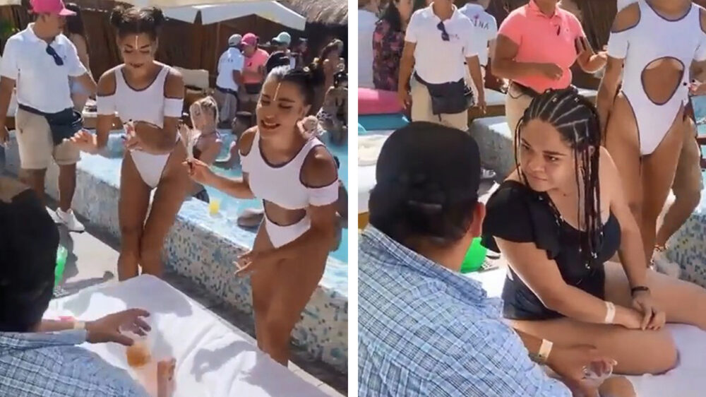 Na al dat harde werken heeft 'ie een luxe all inclusive-vakantie aan het zwembad meer dan verdiend. Hij neemt het er ook lekker van als een groepje dames hem shotjes aanbieden. Yes, wat kan het leven toch mooi... fak, moeders de vrouw gooit weer eens roet in het eten.