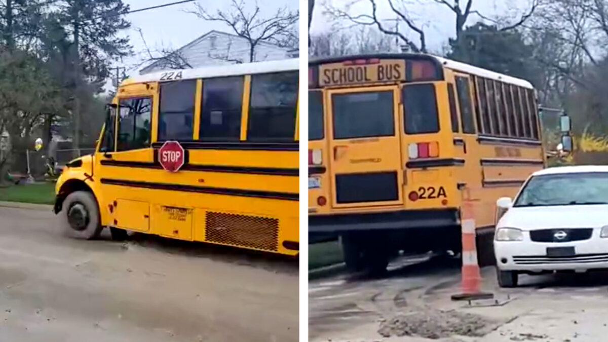 Deze buschauffeur heeft geen zin in omrijden en jankt dwars door vers straatje beton