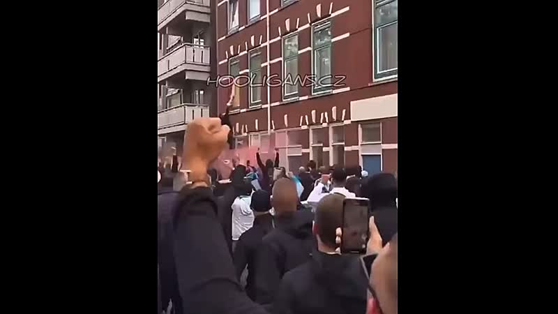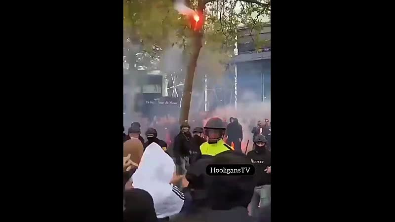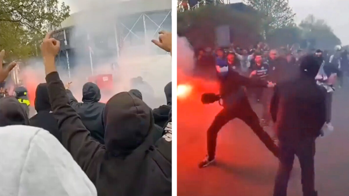 Feyenoord-fans voor de wedstrijd met Marseille met vuurwerk en borden bekogeld