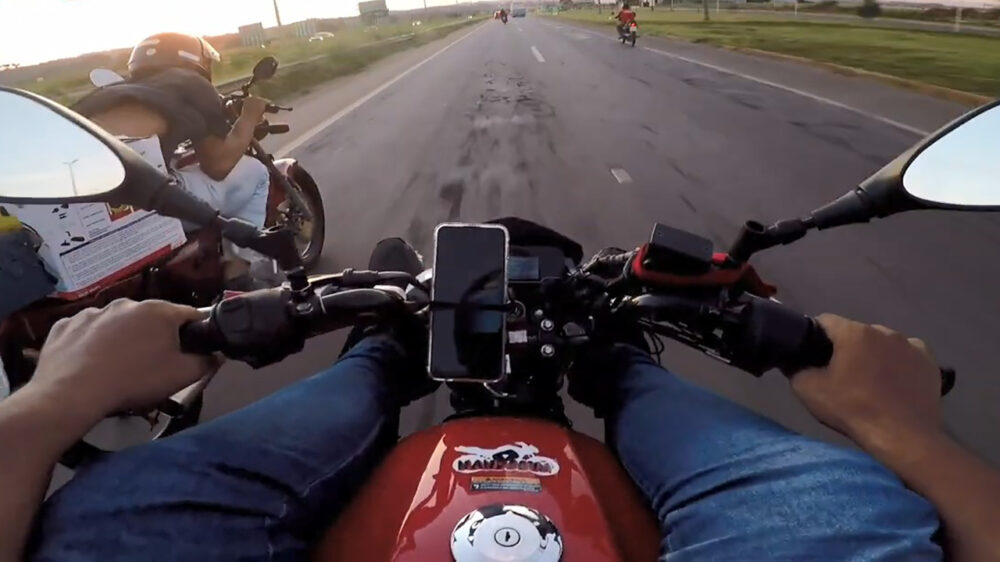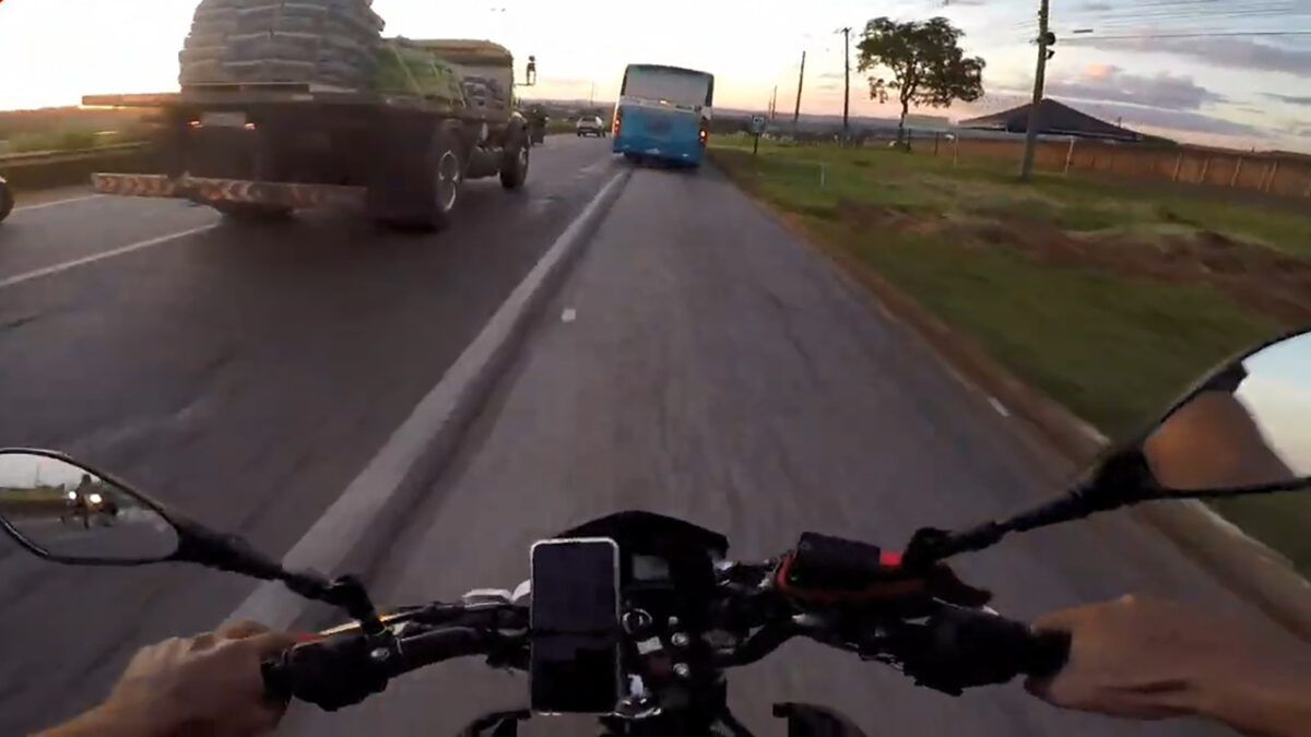 Een iets té zelfverzekerde Braziliaanse motorrijder geniet optimaal als hij een lekker stukje aan het toeren is, maar daar komt al gauw een eind aan als hij op de vluchtstrook met een groot blauw/wit blik op wielen kennismaakt. Gelukkig zijn gescheurde spijkerbroeken trendy...