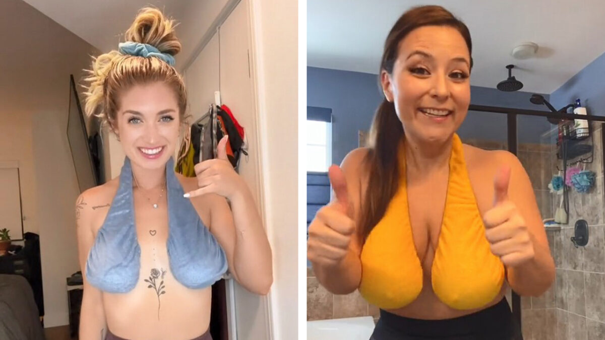 Vrouwen met grote tetten een cupje meer hebben in de zomer vaak het probleem dat het behoorlijk zweterig kan worden onder de koplampen. De ideale oplossing hiervoor is de Ta-Ta Towel; deze bustehouderhanddoek van katoen wordt via de nek om de fatboys gedragen en deze geweldige uitvinding vraagt natuurlijk om een heerlijk zwaartekrachttestje.