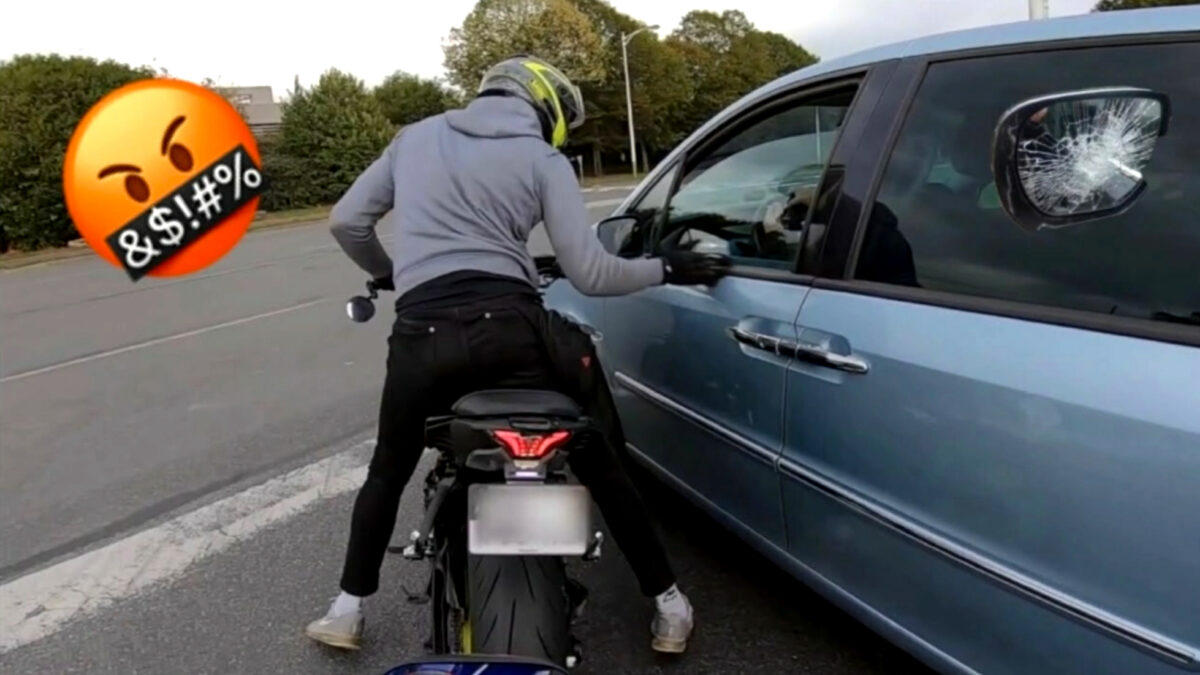 Franse motorrijder slaat zijspiegel van auto tijdens vulgaire straatruzie