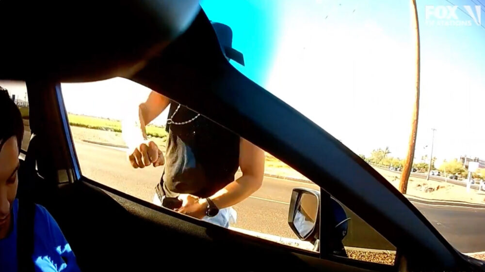 Waar is die goeie ouwe tijd gebleven dat een verkeersfittie nog gewoon werd opgelost met je claxon of als het echt de spuigaten uitliep met een middelvinger? In Arizona ging het er in ieder geval heel anders aan toe waar een idioot tijdens een road rage een pistool op iemand richt. Op dashcambeelden van de 26-jarige Fransisco Garcia is te zien hoe hij bedreigd wordt nadat hij eerder ruzie kreeg in het verkeer. De politie doet onderzoek, dus hopelijk weten ze deze gek snel te pakken.