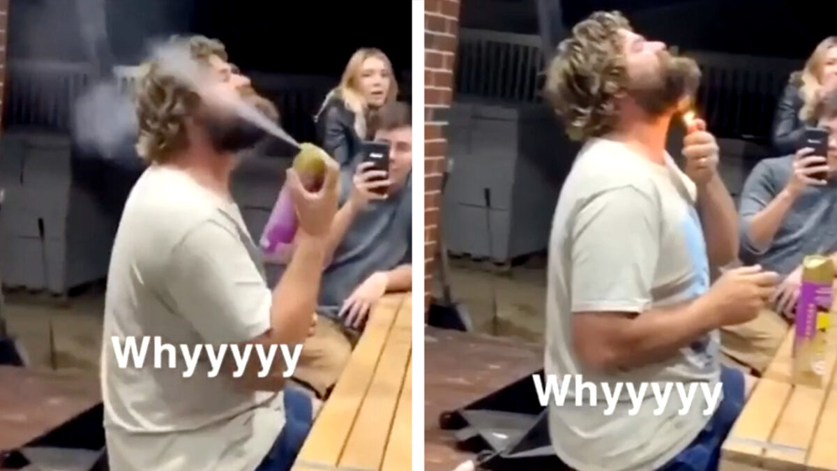 Tijdens de iets te gezellige VrijMiBo heb je vaak de aller, allerbeste ideeën en dat bewijst deze gast vandaag door deo in zijn baard te spuiten en er een aanstekertje bij te houden.