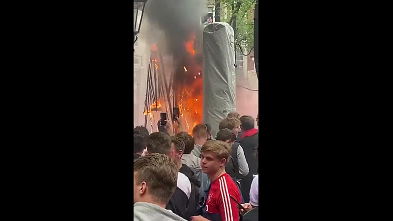 Het Leidseplein stroomt vol met Ajaxfans in de aanloop van de wedstrijd tegen sc Heerenveen vanavond om 20:00 uur. Bij winst is Ajax voor de 36e keer landskampioen. De eerste parasol kon deze warming-up niet helemaal aan en vloog spontaan in brand...