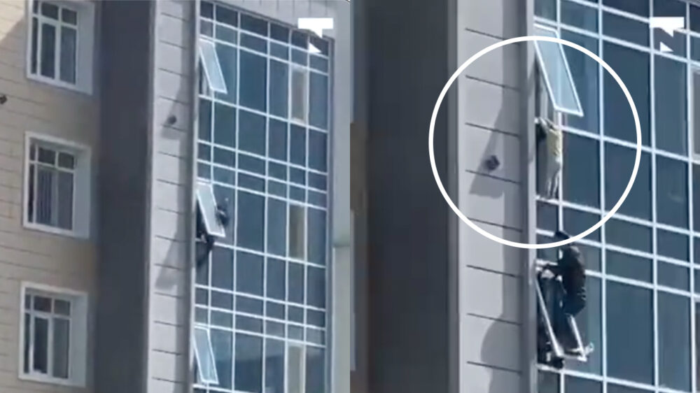 Held in Kazachstan redt kind dat op 7e verdieping uit het raam hangt