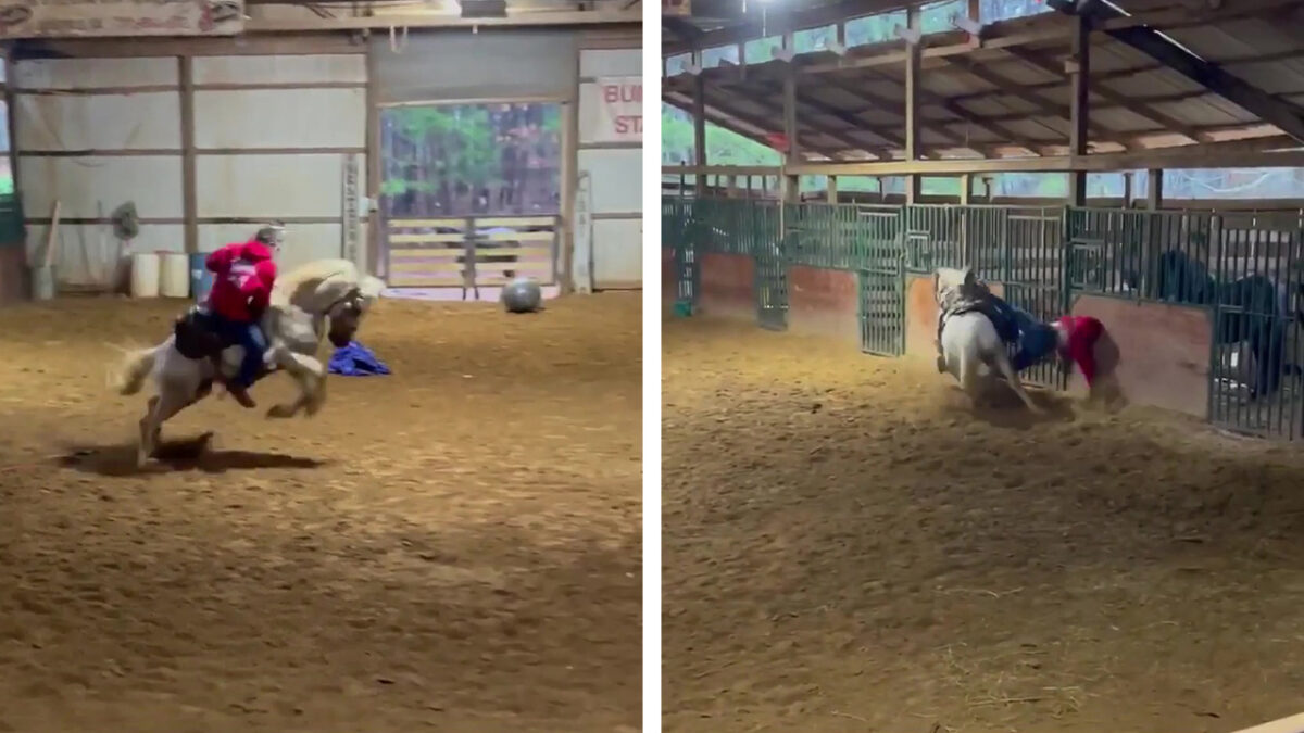 Ruiter wordt eraan herinnerd waarom ze bij het paardrijden een helm dragen Fails