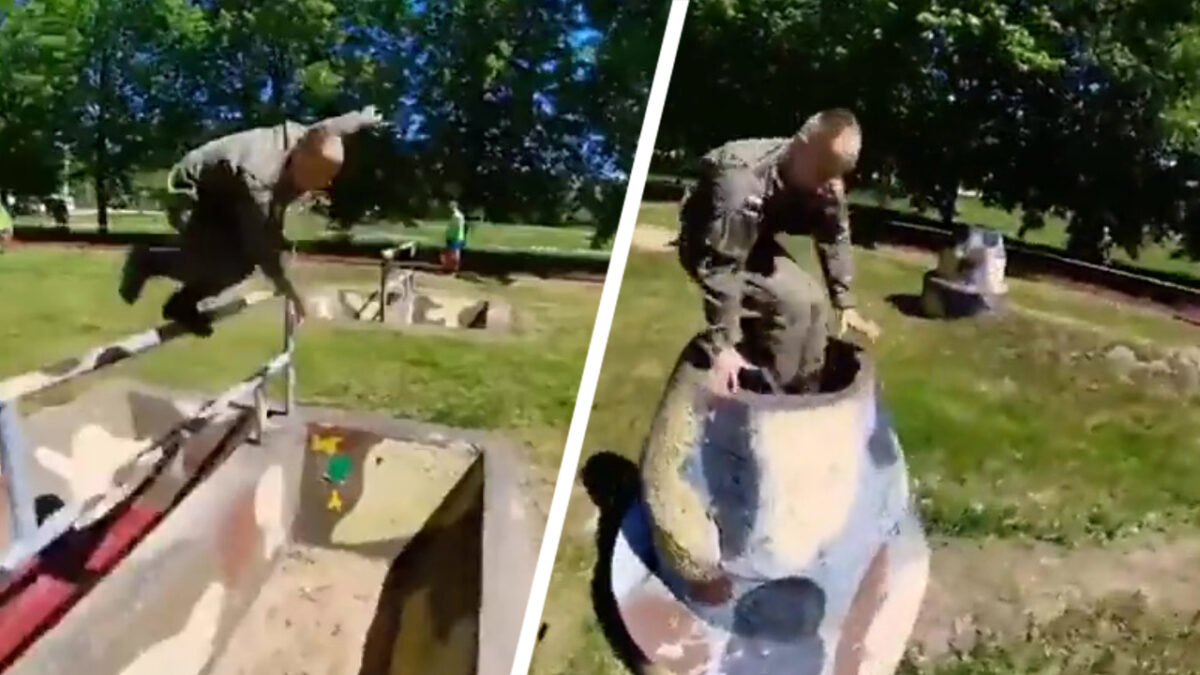 Poolse soldaat knalt over hindernisbaan alsof het een videogame is