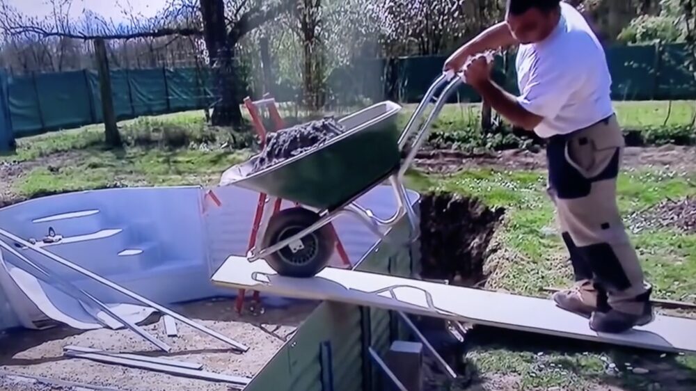 Kruiwagenprofessional demonstreert hoe je een zwembad in je achtertuin bouwt