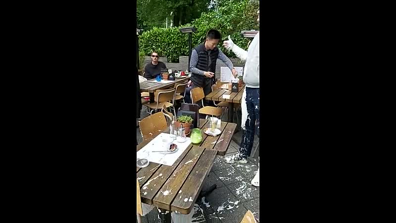 Na hun demonstratie bij het Tropeninstituut in Amsterdam besloten de dames en heren van de actiegroep Voorpost ergens een hapje te gaan eten, maar terwijl ze daar hun witte bammetjes naar binnen werkten, werden ze onverwachts ook op een lading verf getrakteerd.