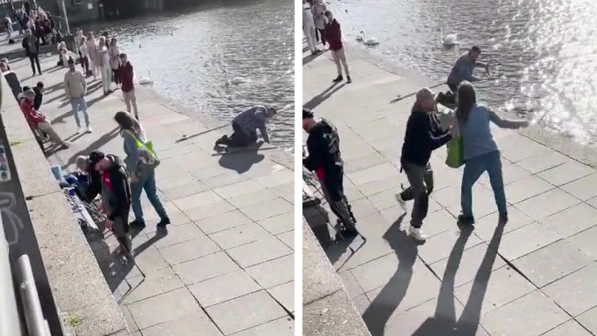 Agressieve Karen wordt het water in geduwd als ze een visser aanvalt