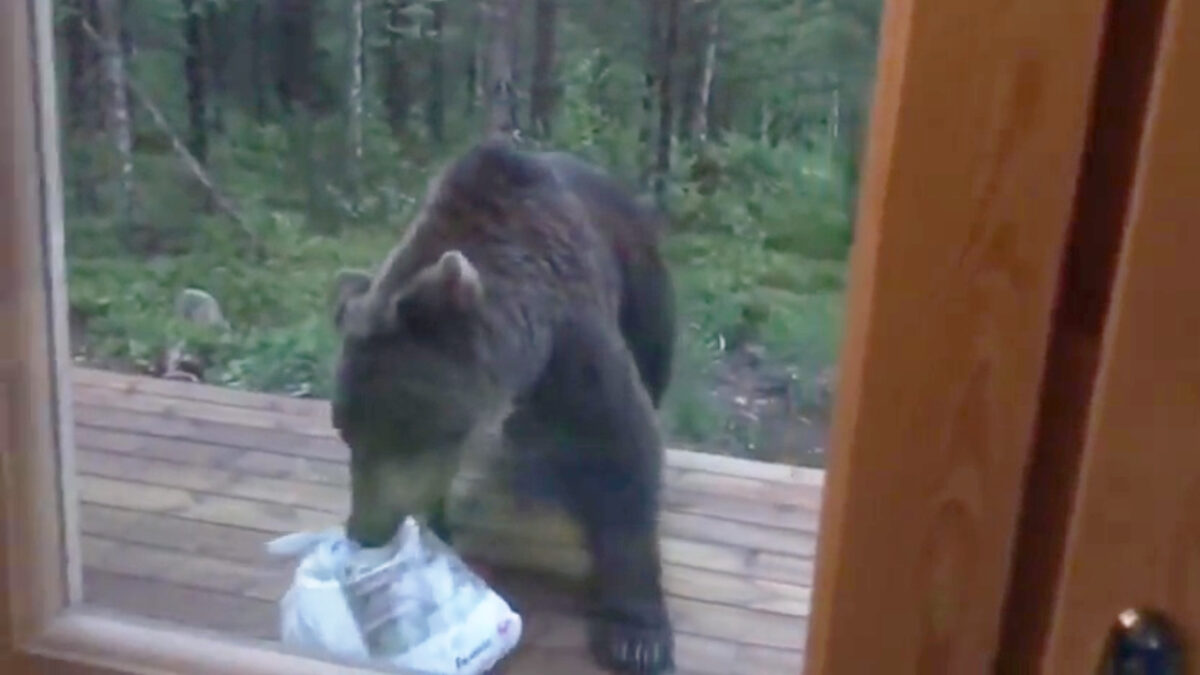 De meeste mensen zouden zich helemaal de blub schrikken als ze een beer hun vuilnis zien jatten, maar deze Fin niet hoor. Oprotten jij, perkele!
