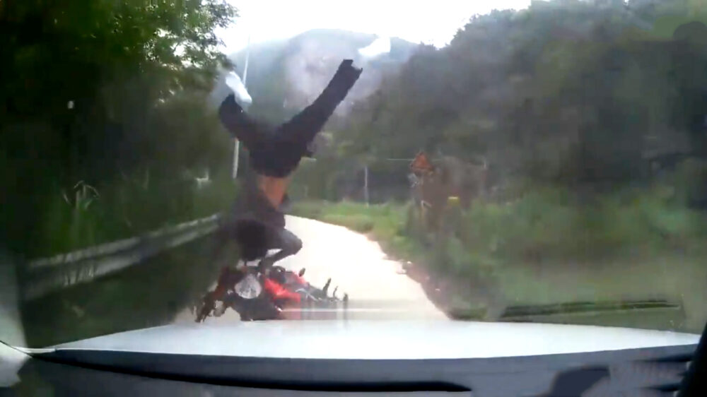 Motorrijder maakt een snoeiharde schorpioen tijdens frontale botsing met auto