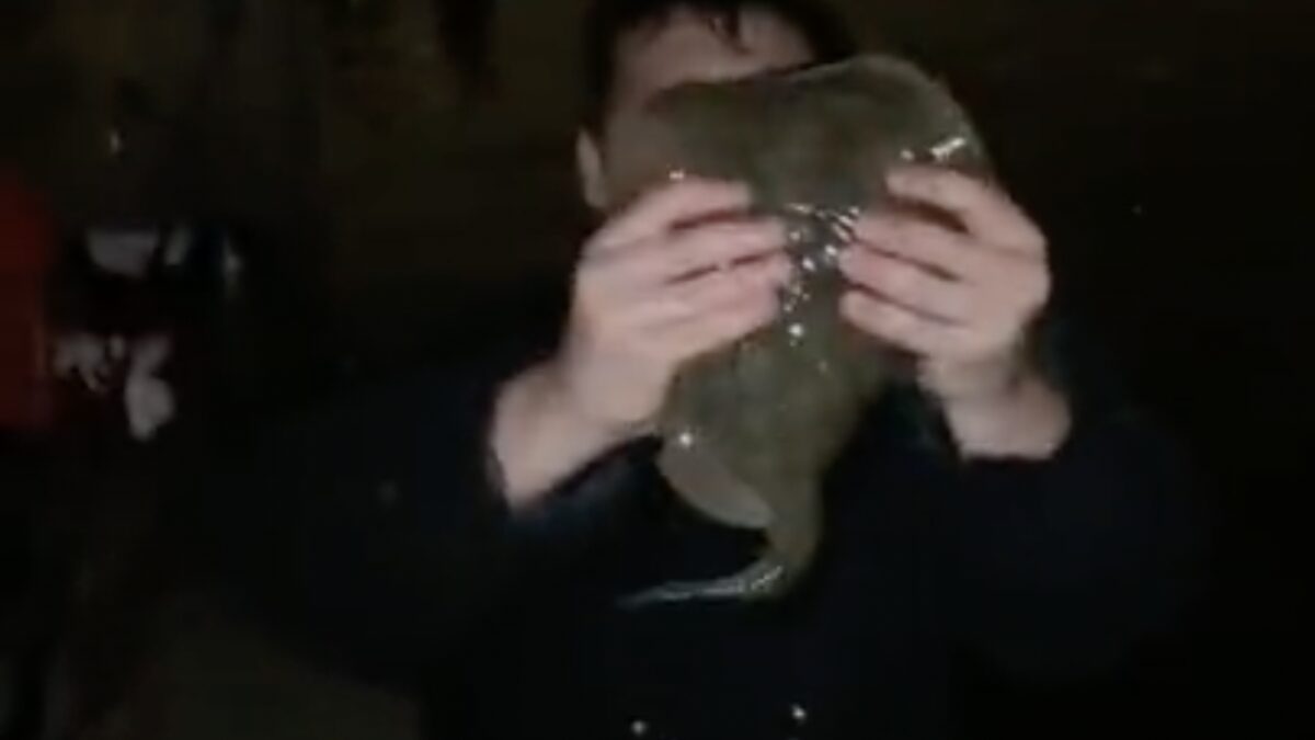 Deze mentaal uitgedaagde is blij dat 'ie een pijlstaartrog heeft gevangen