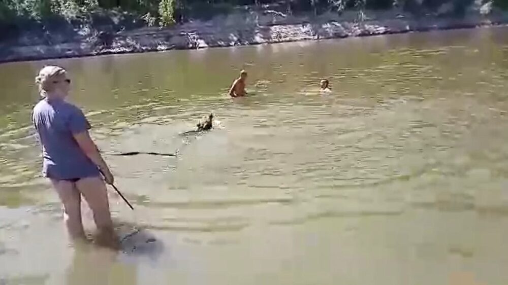 Russische vrouw laat haar huisdier lekker tussen de strandgangers spetteren