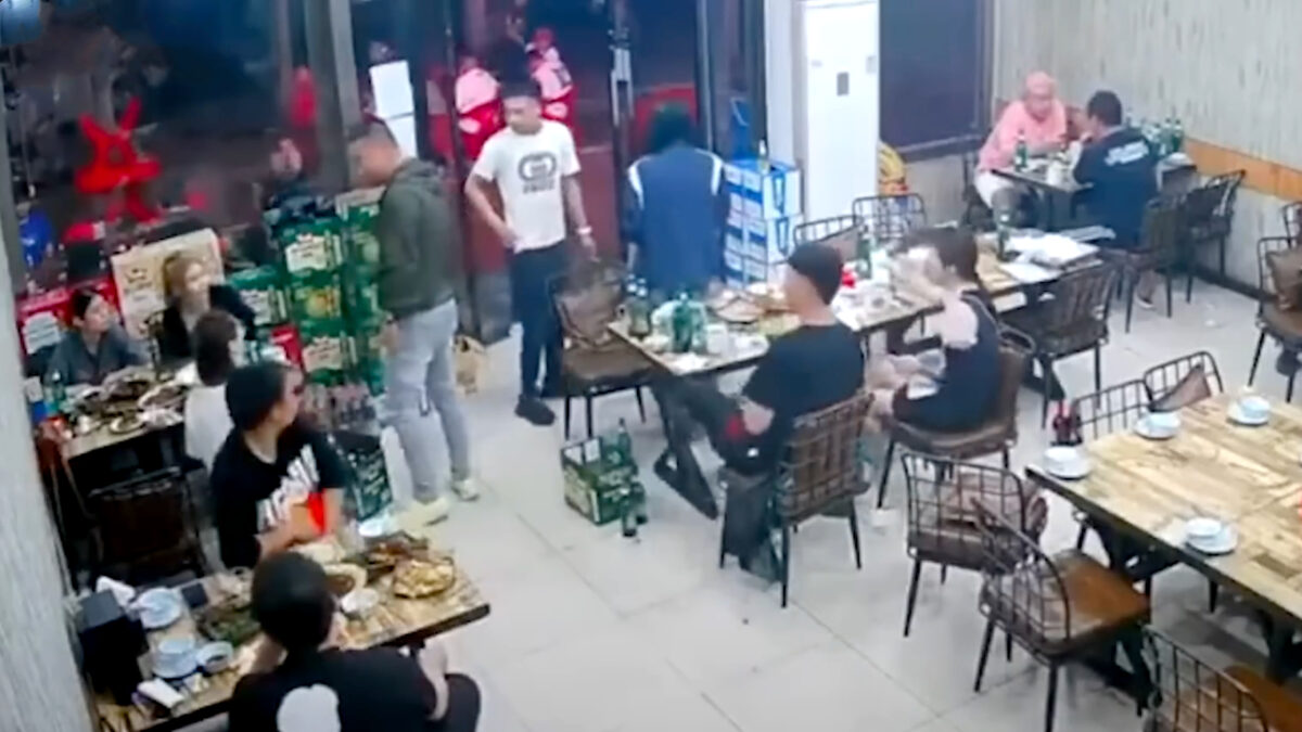 Op deze CCTV-video zijn negen mannen te zien die een groep van vier vrouwen brutaal aanvallen in een restaurant in de noordoostelijke stad Tangshan, nadat één van hen een opdringerige vent had weggeduwd nadat hij zijn hand op haar rug had gelegd. De man blijft over haar heen staan en slaat haar vervolgens in het gezicht als ze hem vraagt te vertrekken.