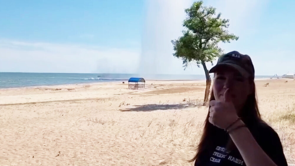 Bij het strand van het Oekraïense Marioepol lagen behoorlijk wat mijnen in het water. Niet echt handig, en dus werden deze units opgeruimd op de allerbeste manier: door ze te laten ploffen. Deze dame besloot om daar eens een kijkje te nemen en zichzelf daarbij te filmen. Omdat het kan, waarschijnlijk.