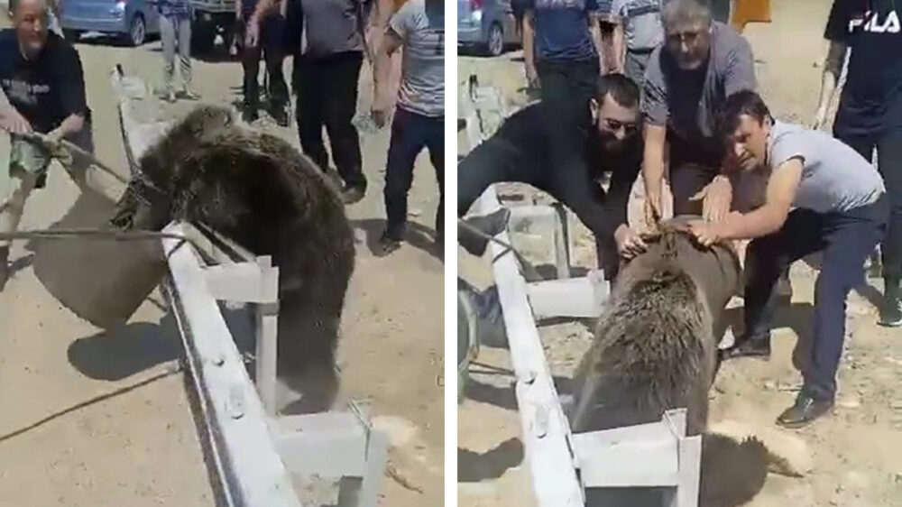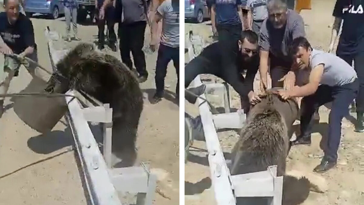 Een groepje dappere mannen schiet massaal te hulp als een beer met zijn hoofd in een ijzeren ton/melkbus vastzit. Het blijkt nog een flinke onderneming om hem los te krijgen, maar ze geven niet zomaar op. En wij maar denken dat die Russen geen gevoel hebben!