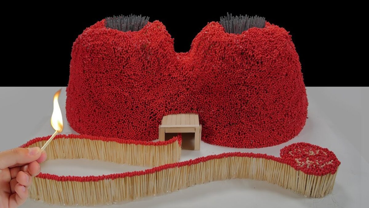 Laats zagen we nog een enkele vulkaan met 100.000 lucifers, maar waarom zou je niet voor een tweekoppige vulkaan met sterretjes gaan? Het kost je in totaal 58 uur aan opnames, maar dan heb je ook wat!