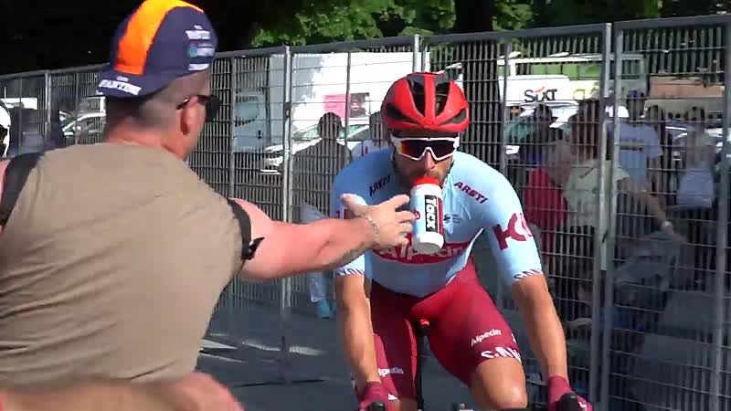 Toeschouwer probeert bidon uit mond van wielrenner Marco Haller te trekken