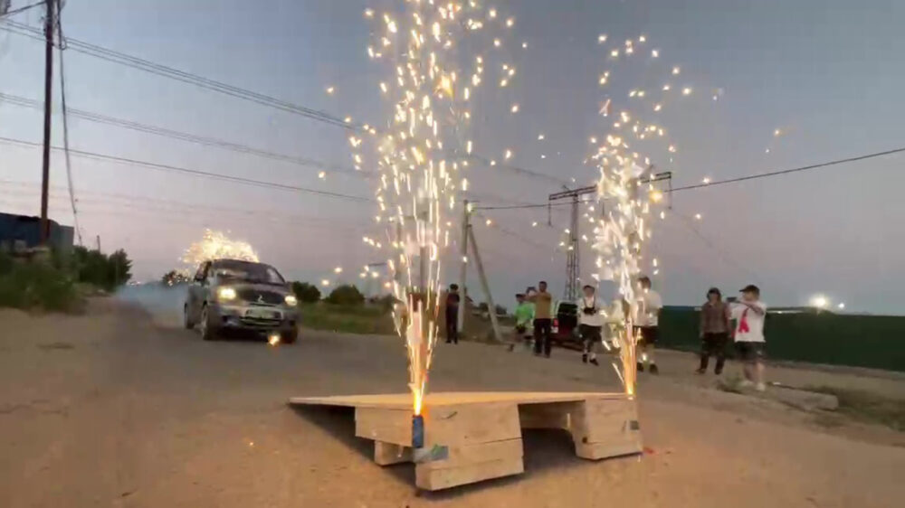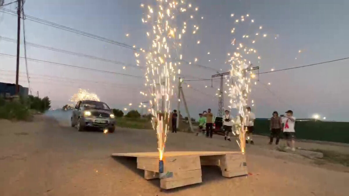 Russische stuntpiloot jankt in volle vaart, via een doe-het-zelf-ramp, de sloot in