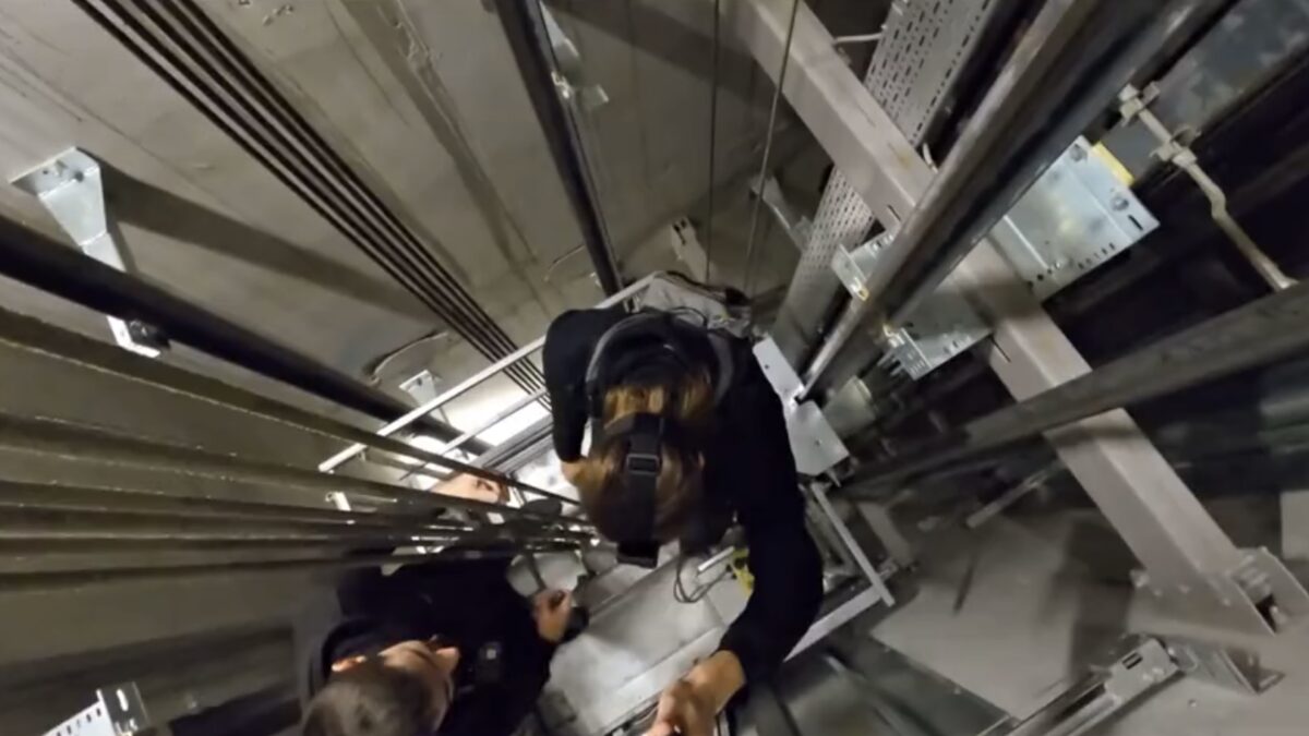 Beste idee van de dag: een liftschacht openbreken en bovenop een lift stappen
