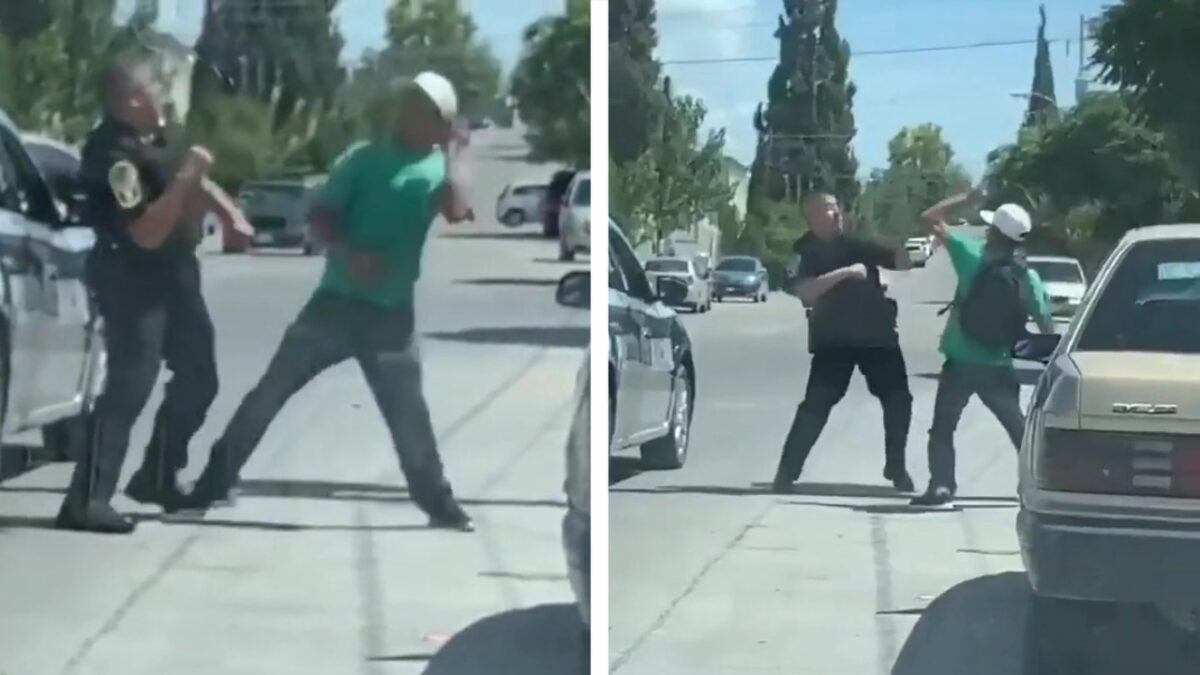 Al eens een politieagent een verkeersfittie met de vuisten uit zien vechten?