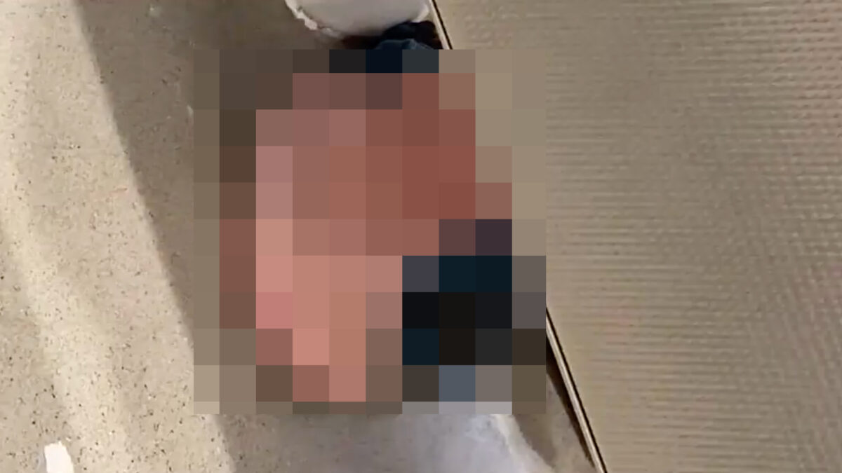 Op een openbaar toilet een bruine trui breien is per definitie niet echt ontspannen, laat staat als je ineens dit naast je ziet zitten.