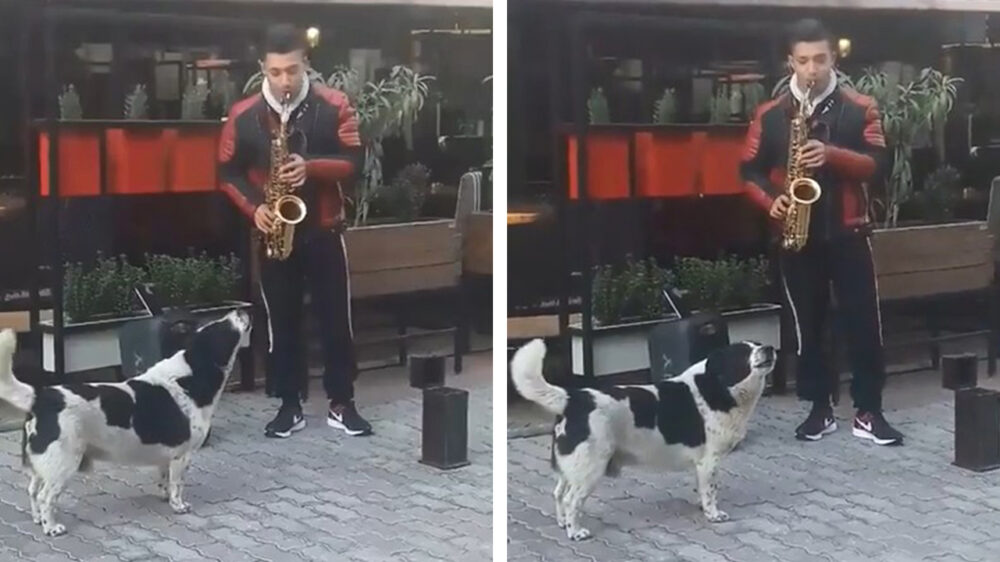 Straatartiest wordt bijgestaan door een viervoeter met een gouden keeltje