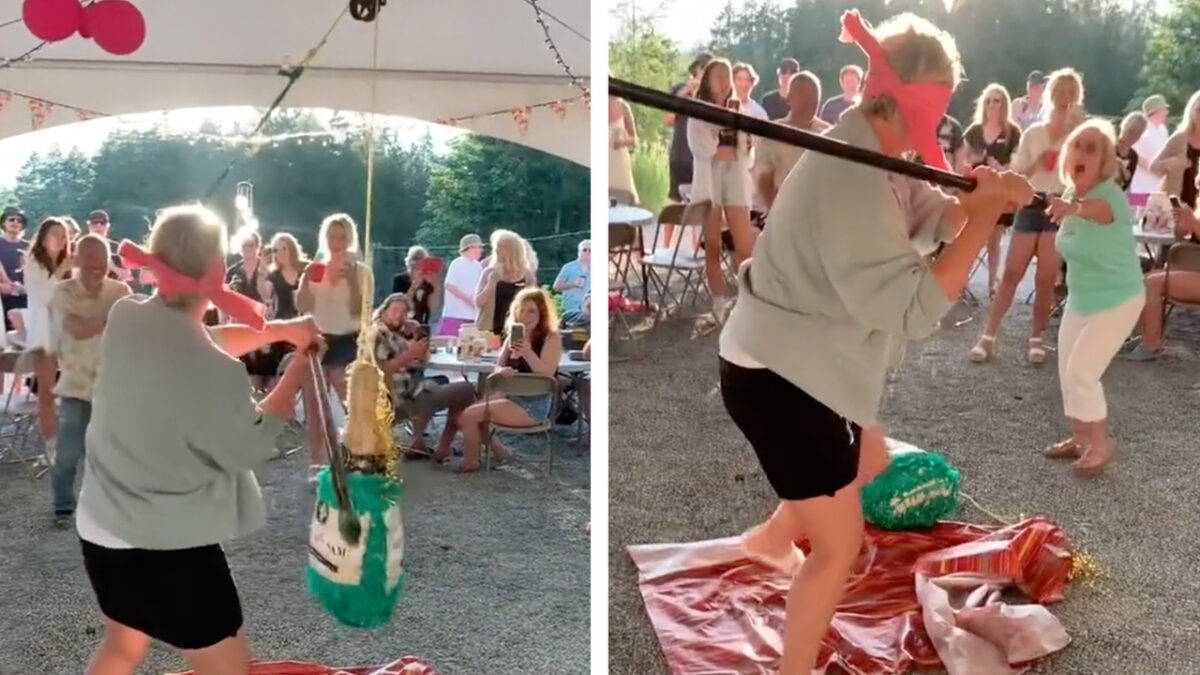 Oma wordt gevloerd tijdens een ouderwets potje piñata meppen