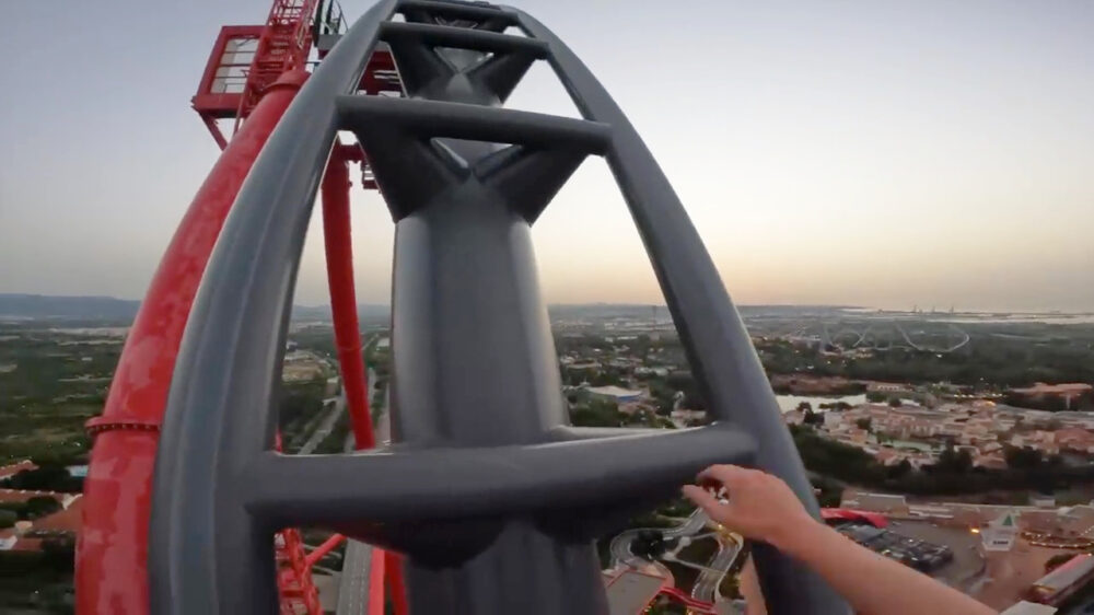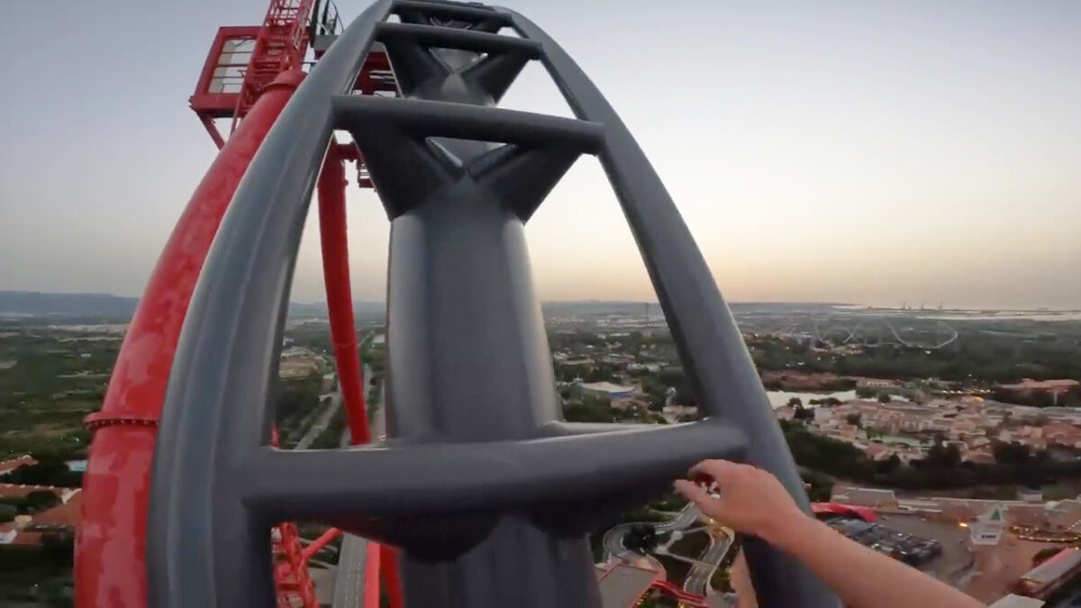 Met een hoogte van maar liefst 112 meter is Red Force in Ferrari Land (Salou, Spanje) de hoogste achtbaan van Europa. Dat 'ie ook 180 kilometer per uur gaat is leuk, maar voor vandaag niet relevant want er gaat geklommen worden! Basejumper (met doodswens waarschijnlijk) George King klom namelijk zonder enige vorm van zekering naar boven om er doodleuk weer vanaf te springen. Zweethandjes in 3... 2... 1...