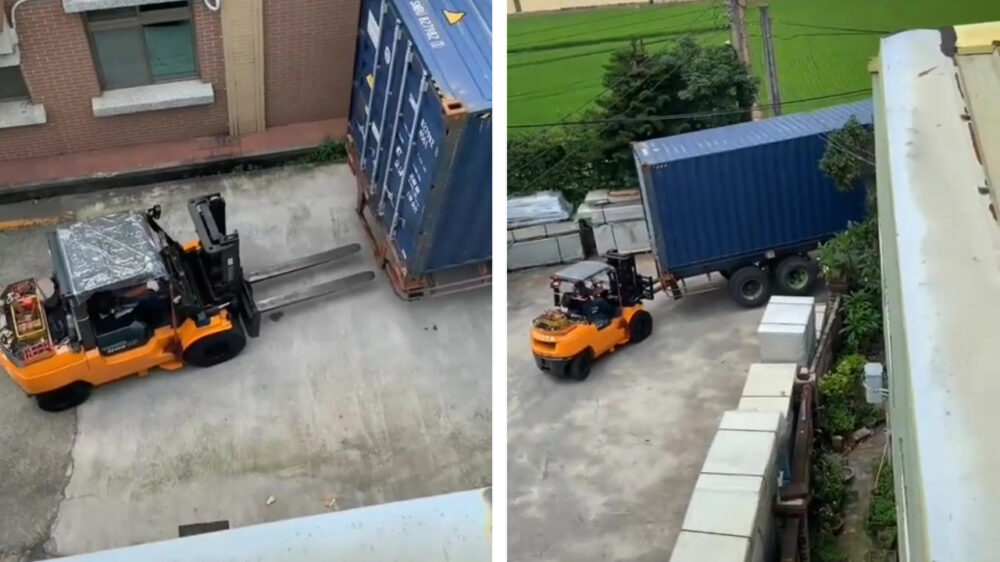 Een vrachtwagen heeft een draaicirkel ter grootte van Oost-Timor, maar gelukkig heeft deze bestuurder daar wat op gevonden tijdens het navigeren door deze smalle doorgang.