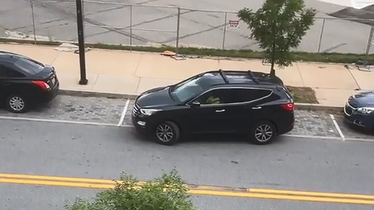 Vrouwelijke weggebruiker probeert haar slagschip op een kleine parkeerplaats te stallen