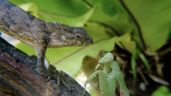 Roofzuchtige bidsprinkhaan gaat vol in de aanval als 'ie een hagedis tegenkomt