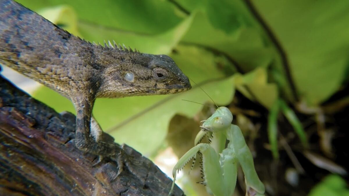Roofzuchtige bidsprinkhaan gaat vol in de aanval als 'ie een hagedis tegenkomt