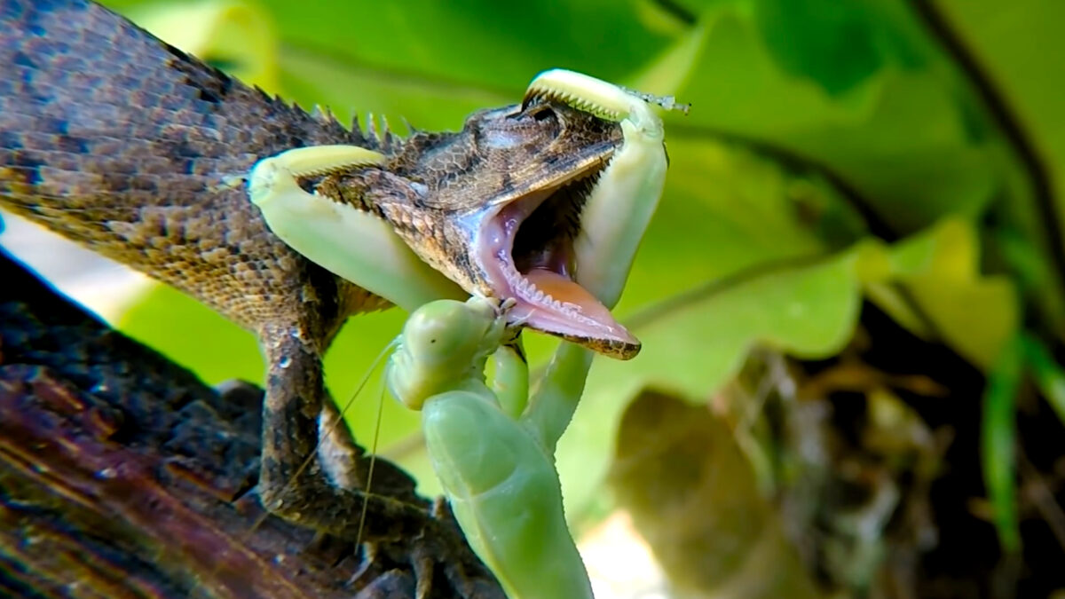 Roofzuchtige bidsprinkhaan gaat vol in de aanval als 'ie een hagedis tegenkomt