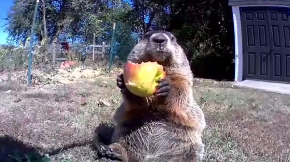 Gewetenloze bosmarmot eet zijn pas gejatte fruit voor de camera van de boer op