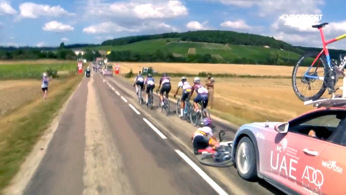 🚴🇫🇷 | Alsof een paar lekke banden nog niet erg genoeg waren.. wordt Mavi Garcia onderuit gereden door haar eigen ploegauto! 💥💥 #TDFF