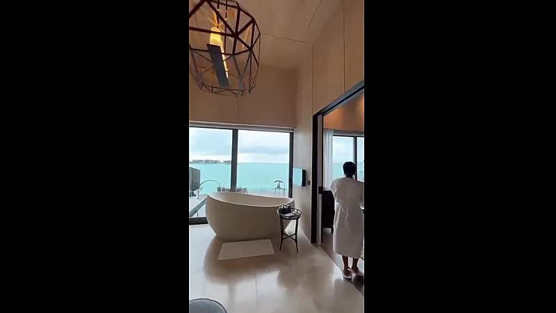 Een jongedame leidt ons rond in een luxe villa in een resort op een privé-eiland. Deze perfecte tour had ze willen afsluiten door gracieus van haar steiger in zee te springen, maar daar stak iemand een stokje voor.