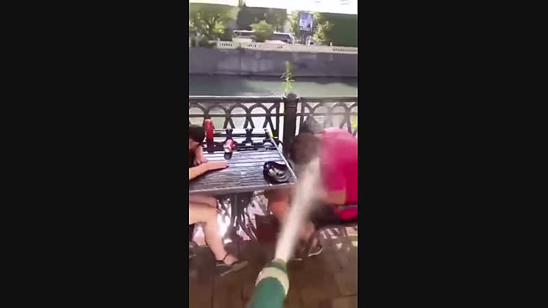 Ober probeert van bezopen stelletje af te komen door ze te bewerken met een tuinslang Fun