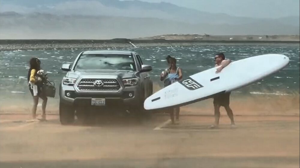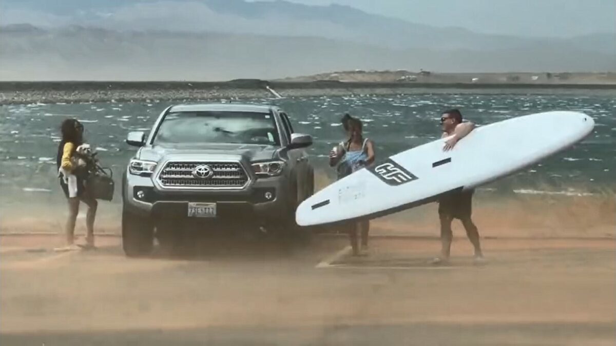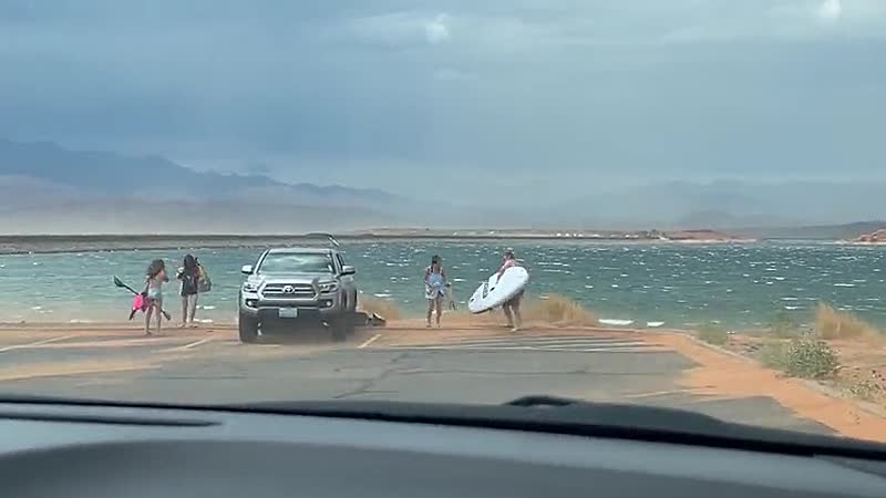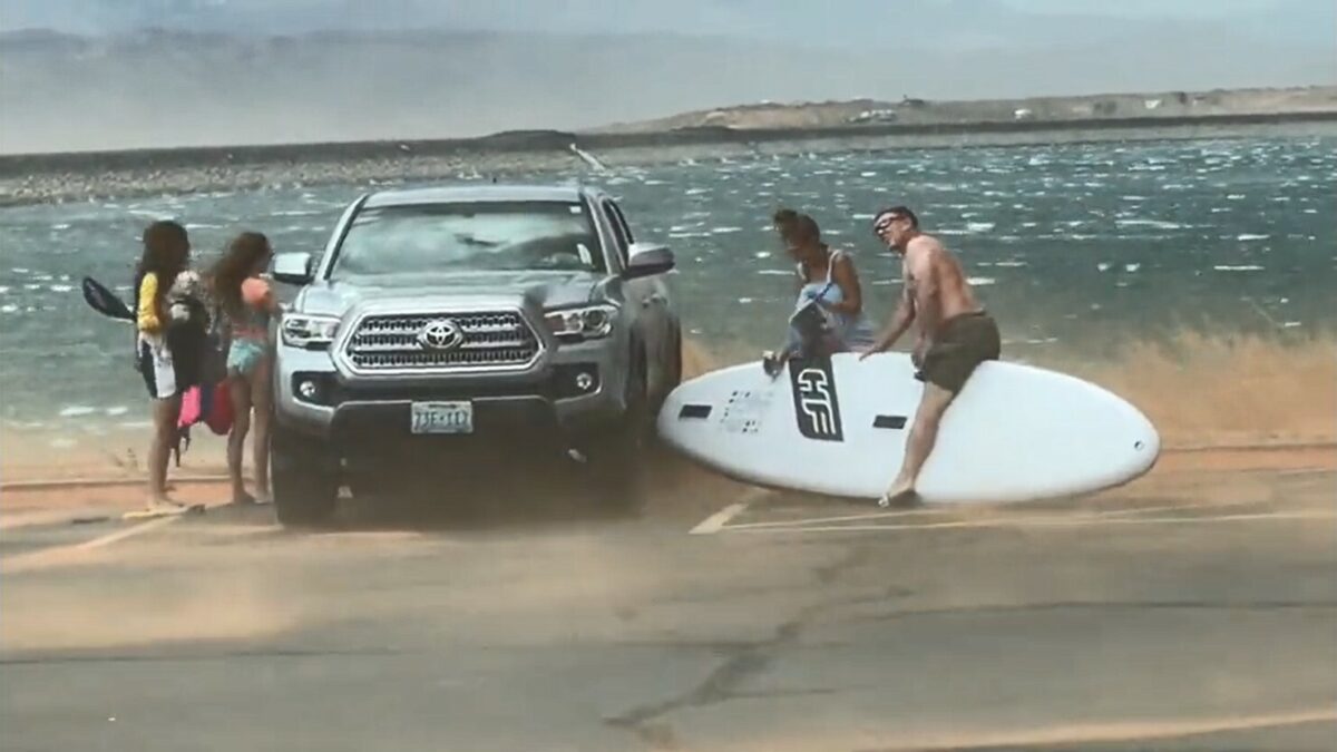 Een man probeert na een lekker dagje op het strand zijn paddleboard op te bergen, maar daar denkt moedertje natuur anders over terwijl ze voor een extreme windhoos zorgt.