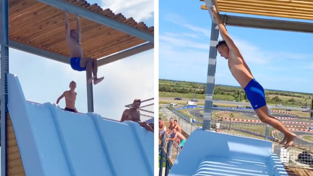 De afgelopen dagen duiken (pun intended) er steeds meer video's op van een flinke glijbaan waar mensen met een behoorlijke snelheid van af knallen. Gaat blijkbaar om het Frenzy WaterPark in Frankrijk. Zo zagen we een waaghals die vanaf het dak sprong en niet echt lekker landde, maar ook een chick die een poging waagde en ook niet helemaal goed terecht kwam.