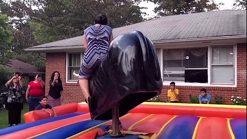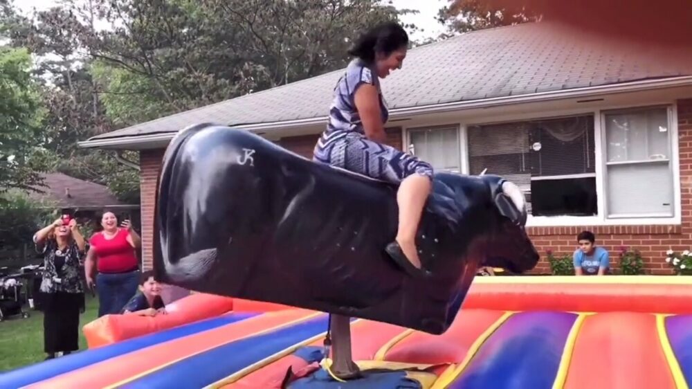 Nu heb je als jongedame met een (te) kort rokje natuurlijk al snel genoeg aandacht als je op een mechanische stier stapt, maar ook deze moeder heeft alle ogen op zich gericht tijdens de jaarlijkse buurtbbq.