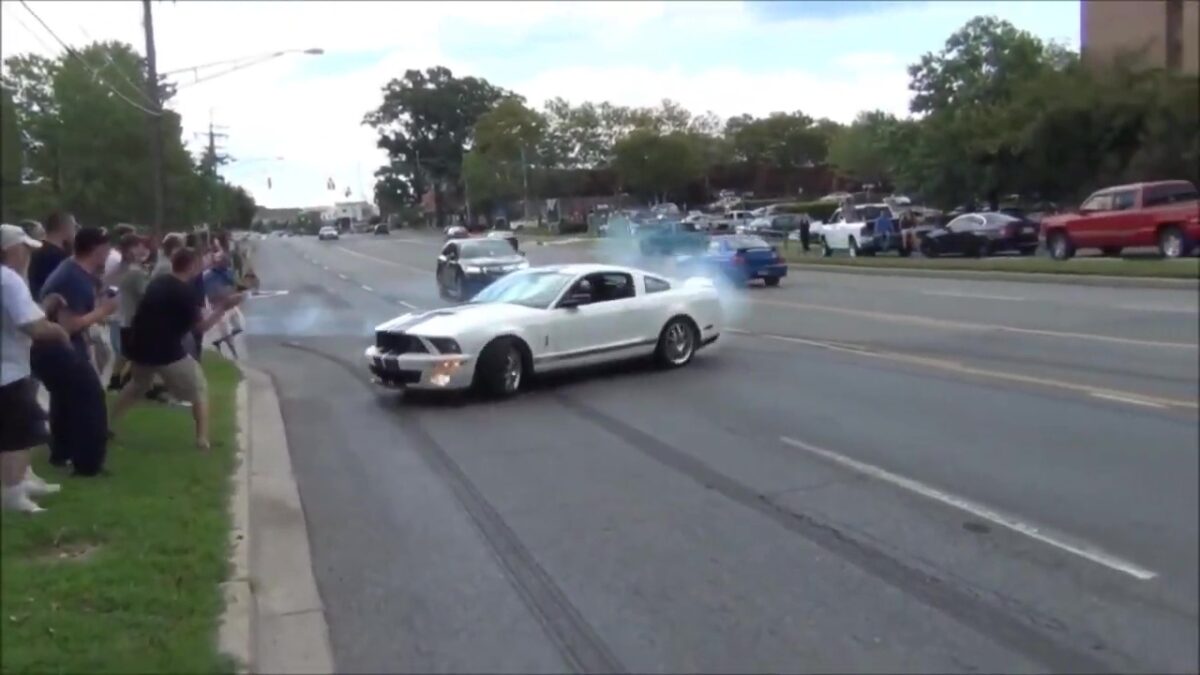 Uitslover parkeert zijn Mustang in het publiek als 'ie probeert te driften