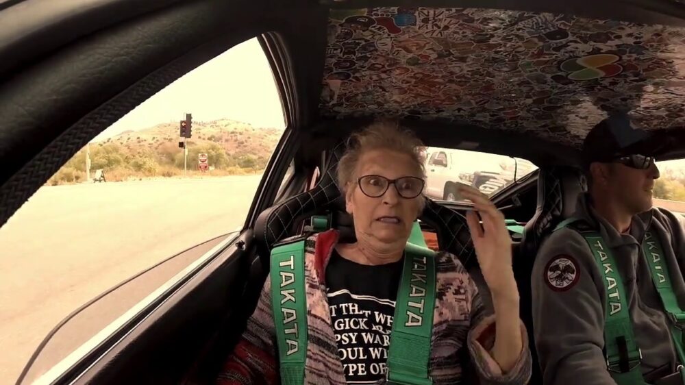 Moedertjelief besluit een ritje in de nieuwe auto van haar zoon te maken. Mop, mop gas erop.
