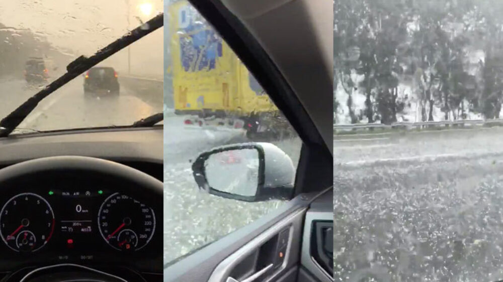 Het was natuurlijk geen Madrid waar ze de straat uit werden gevaagd, maar de plaatselijke hagelbui van gisteravond was blijkbaar heftig genoeg om de auto op de vluchtstrook te parkeren omdat je niet fatsoenlijk meer kon doorrijden.