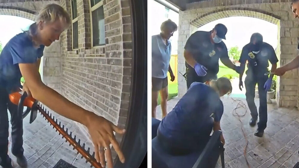 Moedertje komt met haar vingers vast te zitten in een heggenschaar