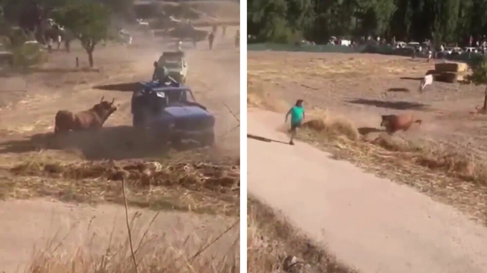 Kerel wordt aangevallen door stier, maar weet soort van 'veilig' te ontsnappen