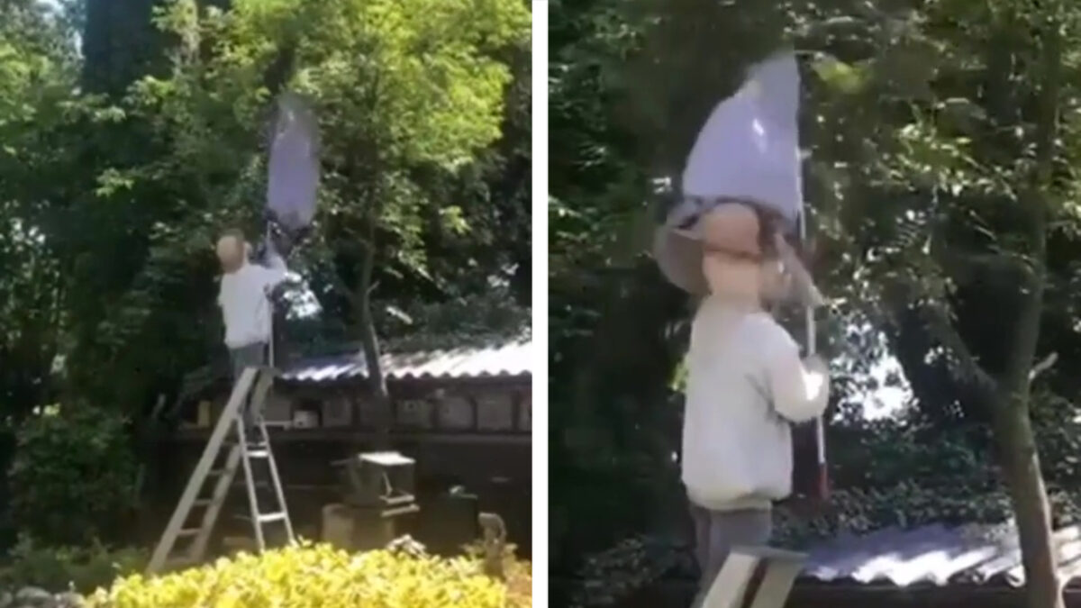 Protip: als je een wespennest in je tuin hebt hangen, laat deze dan verwijderen door een professional. We weten namelijk niet hoe Bennies gezicht er nu uitziet...