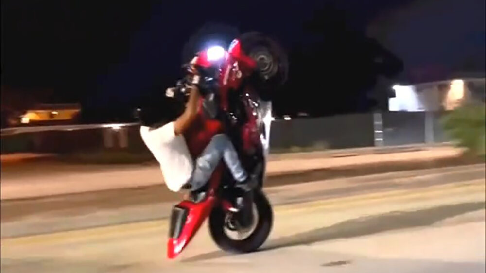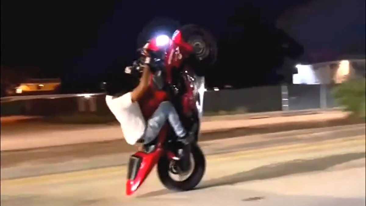 Motorbink geeft het asfalt een kusje na mislukte wheelie